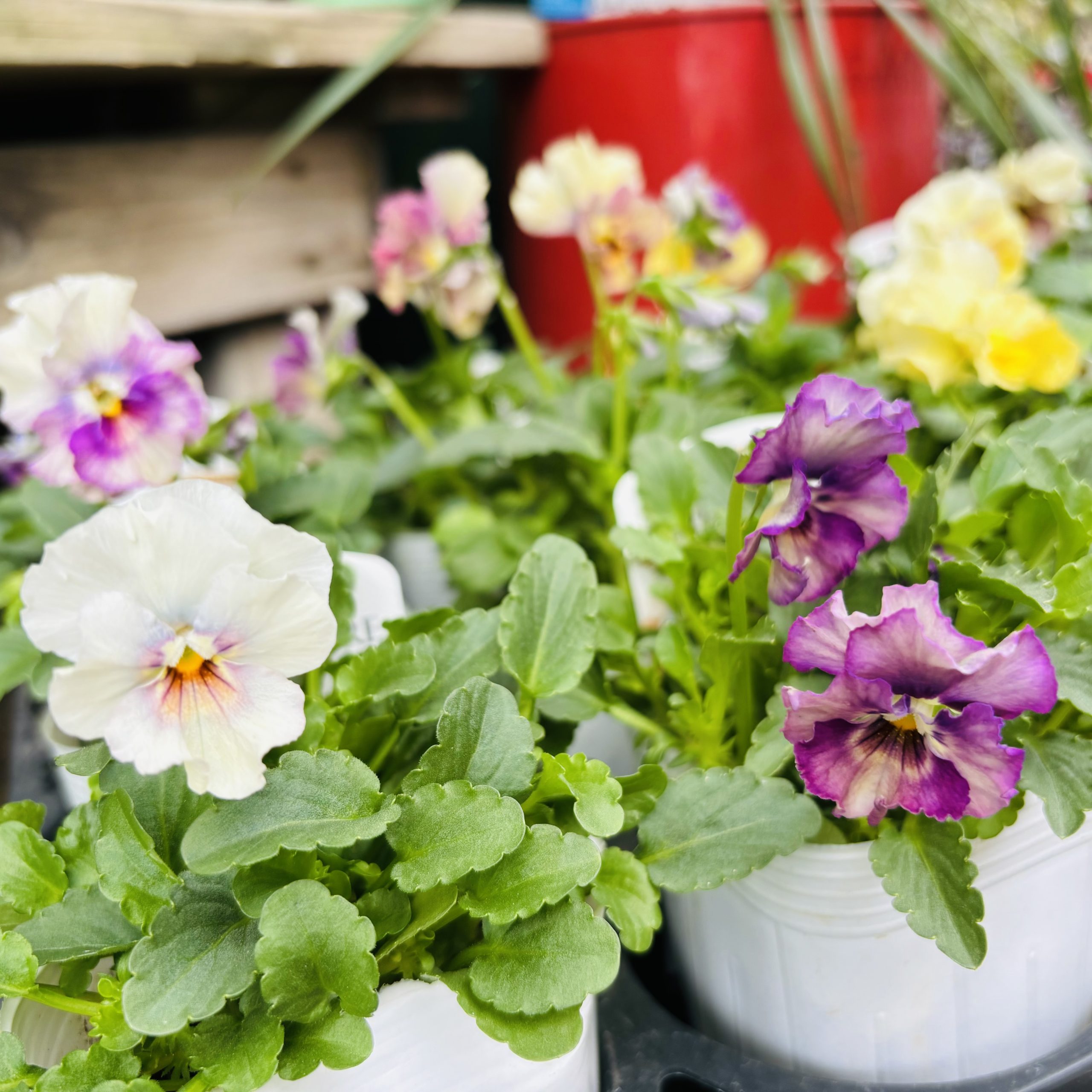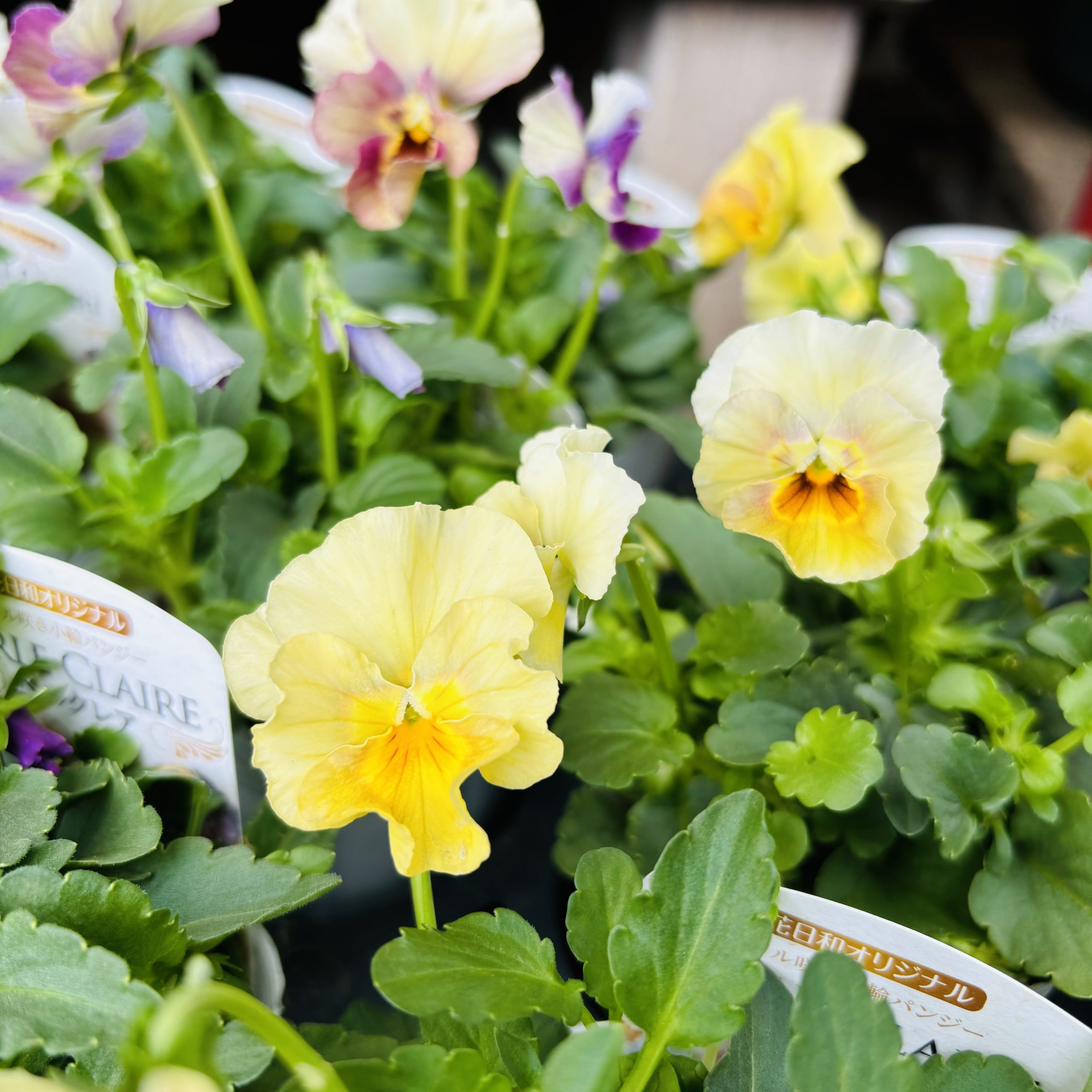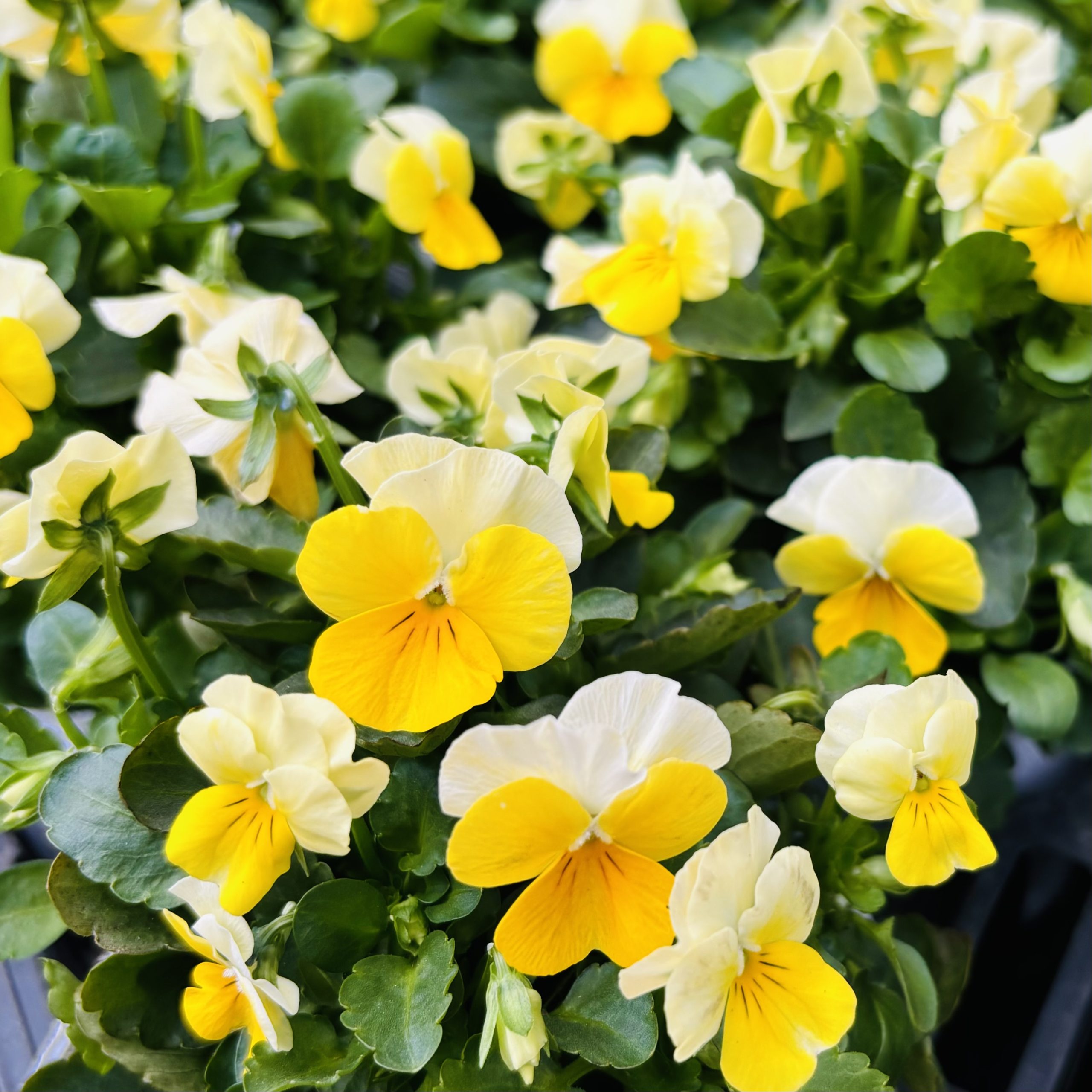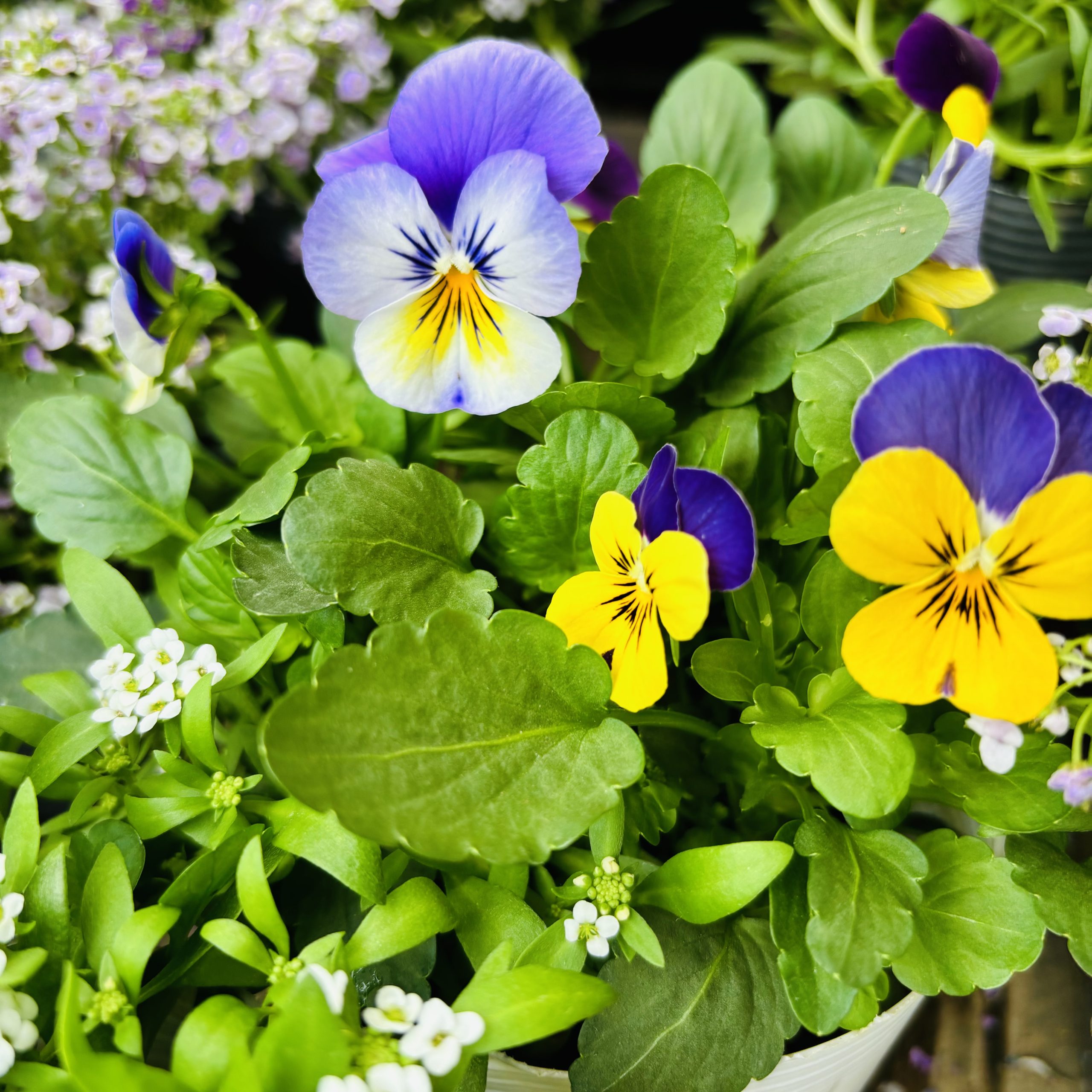 2色のビオラとアリッサムが寄せ植えされています✨