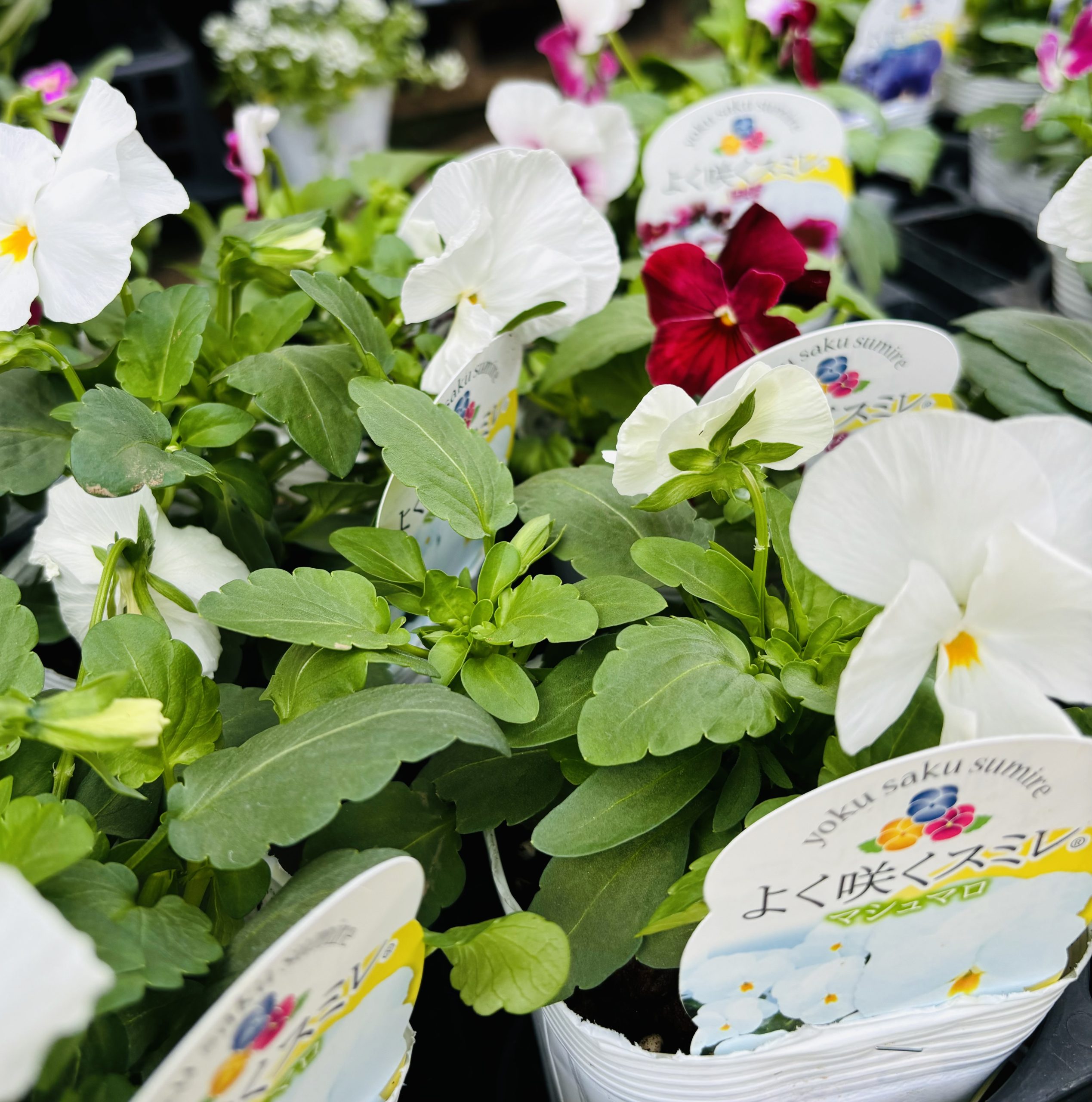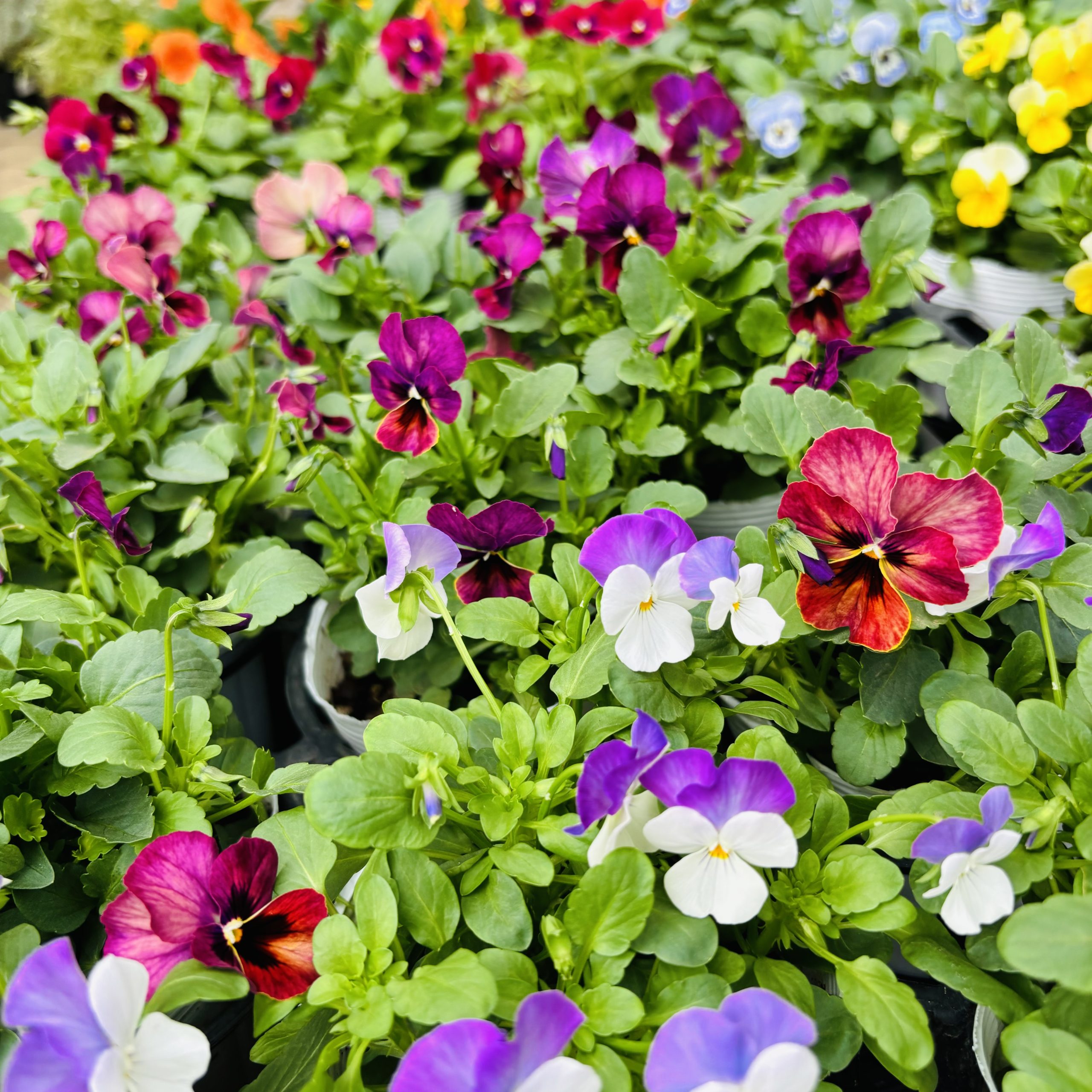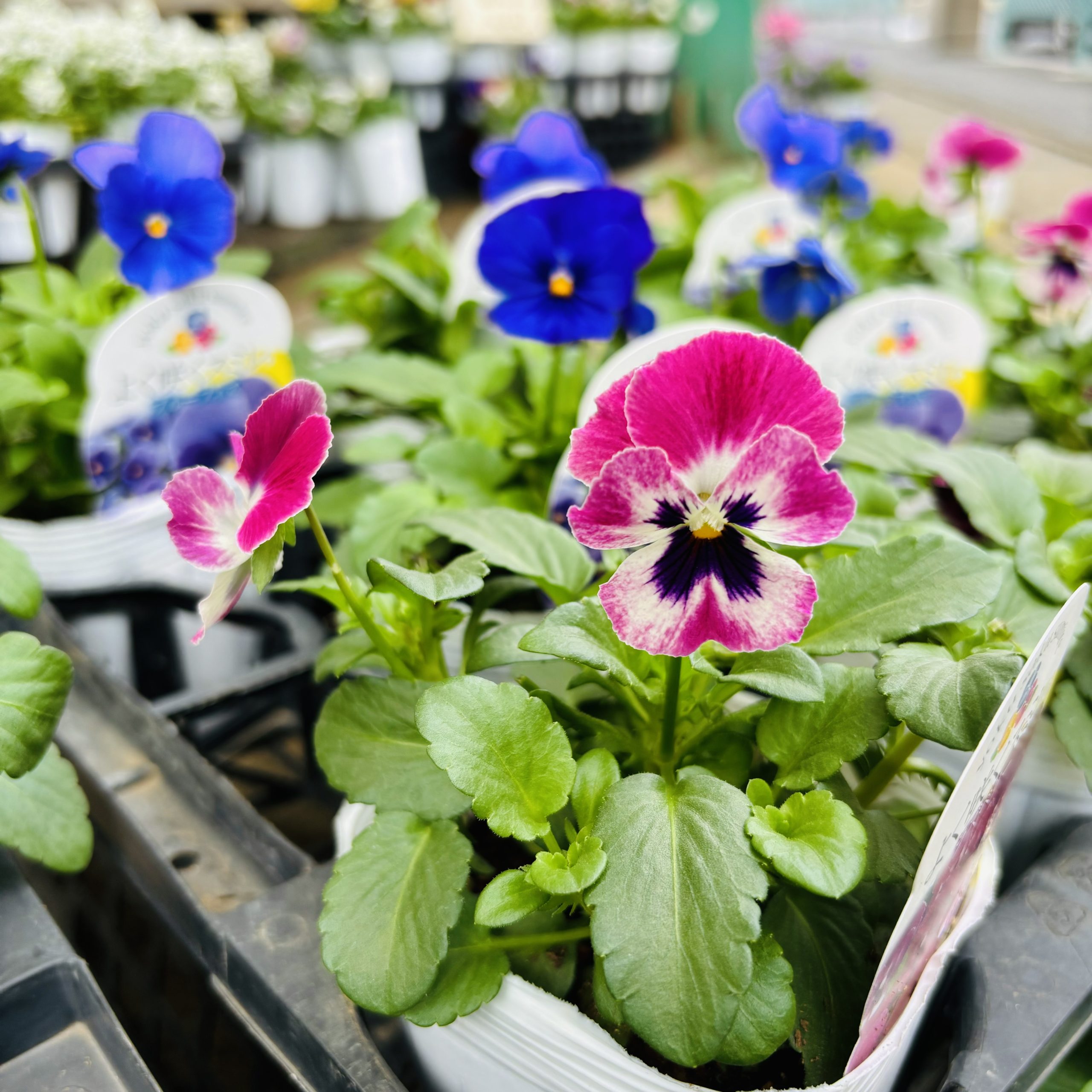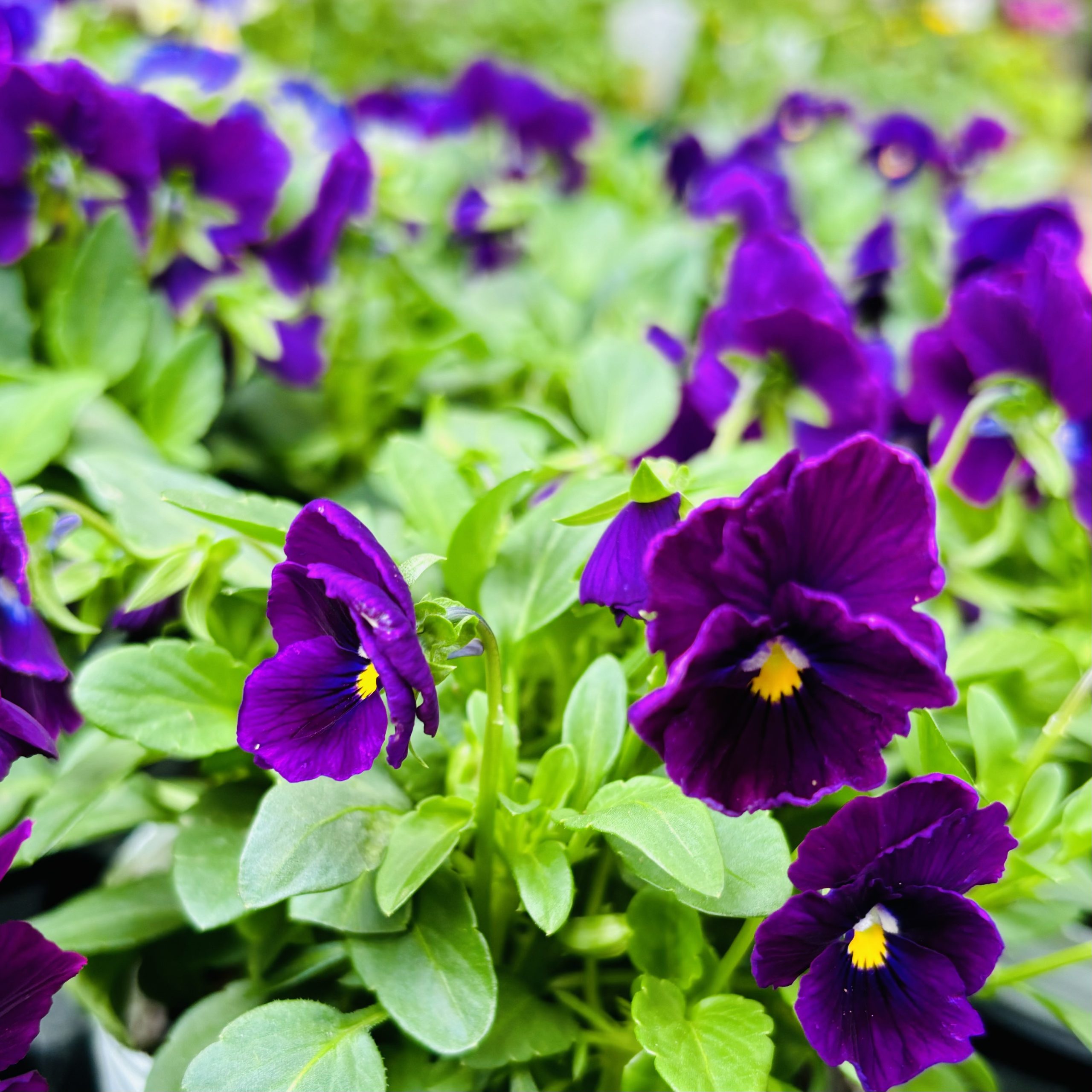 2色のビオラとアリッサムが寄せ植えされています✨